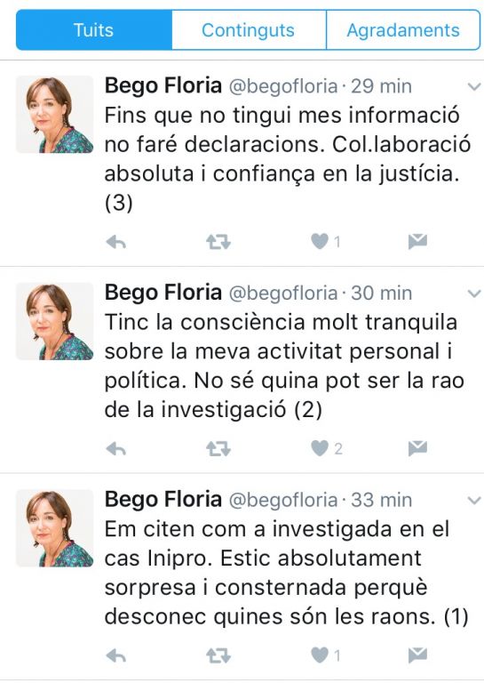 Begoña Floria haurà de declarar com a investigada en el cas Inipro. El jutge, que ha aixecat el secret de sumari, la cita a ella i a Gustavo Cuadrado, ex cap de gabinet de l’alcalde, pel 19 de gener. Hauran de declarar al Jutjat d’Instrucció número 1 de Tarragona. En l’auto, a més, el jutge cita com a partícip a títol lucratiu al mateix PSC. La mateixa Floria confirmava la notícia mitjançant el seu compte de Twitter. Ha dit que es mostra «absolutament sorpresa i consternada» perquè desconeix «quines són les raons». «Tinc la consciència molt tranquil·la sobre la meva activitat personal i política», ha afegit, i ha insistit en dir que no sap «quina pot ser la raó de la investigació».