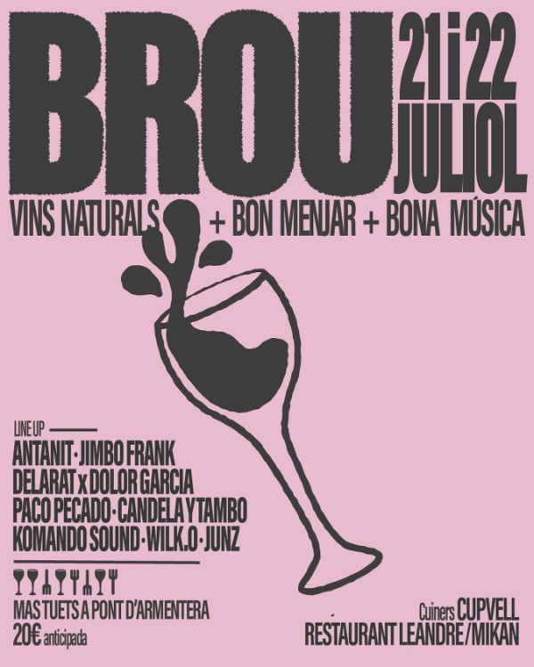 El Mas Tuets a la població Pont d’Armentera podrem gaudir de Brou. Festival que presumeix de Vins Naturals+ Bon menjar + Bona Música. Ho podreu gaudir el 21 i 22 de Juliol amb una entrada anticipada de 20 euros. https://tickety.es/event/brou-destiu