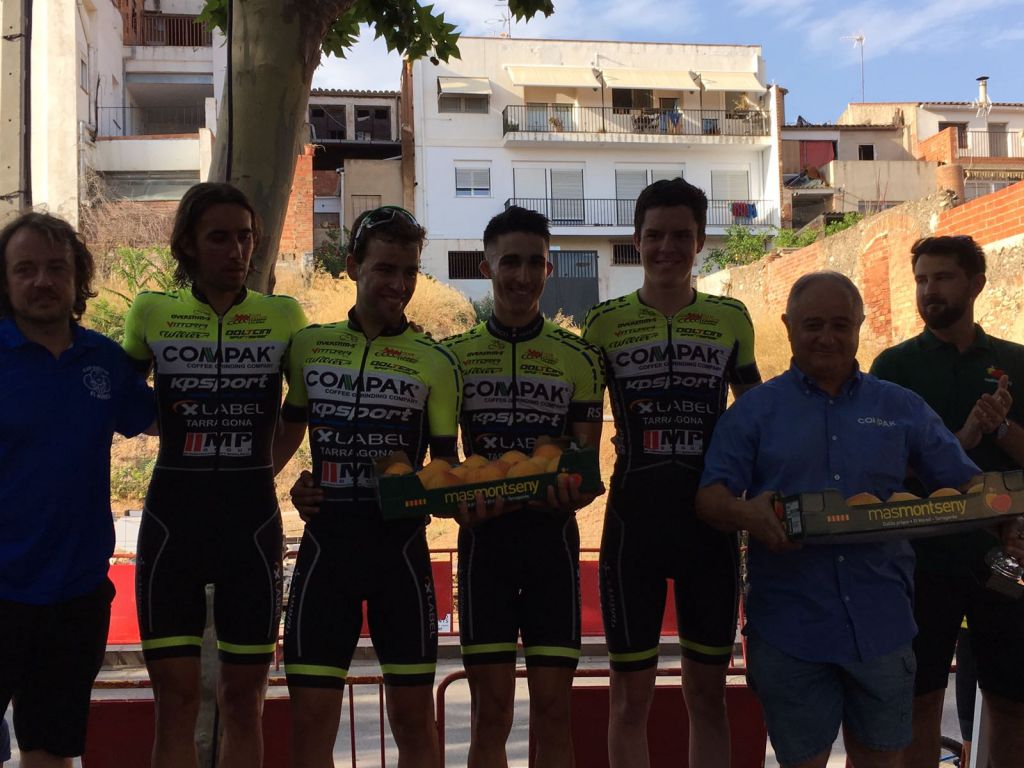 El Compak-Campclar ha tancat aquest diumenge un cap de setmana intens que ha arrodonit amb el premi al millor equip del Critèrium del Morell. En aquest Gran Premi del Préssec per elits i sub-23, Gerard Armillas ha estat tercer en la classificació general i primer en la categoria sub-23. La competició del Morell ha arribat enguany a la 55a edició i s’ha disputat en el tradicional circuit urbà de poc més d’1 quilòmetre de la Rambla Pau Casals. Els ciclistes han hagut de completar 75 voltes. Un dels obsequis més preuats han estat les capses de préssecs que els guanyadors han lluït al podi a on ha pujat també el manager Antoni Pineda per celebrar la victòria per equips.