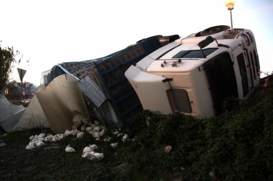 Publicado enNotícia Un camió amb 5.500 pollastres bolca en una rotonda de l’autovia C-42 a Tortosa per Redacció 20/12/2011
