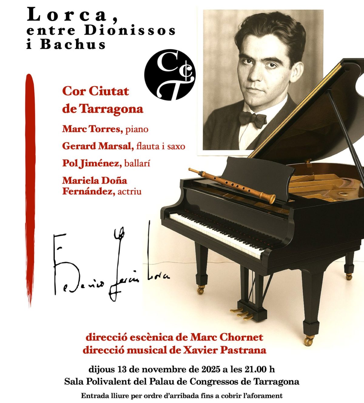 Dins la programació 90 anys de la visita de Lorca a Tarragona que té en marxa l’Ajuntament, aquest dijous 13 de novembre a les 21h, se celebrarà el concert Lorca, entre Dionissos i Bachus a la sala polivalent del Palau Firal i de Congressos. El Cor Ciutat de Tarragona ha volgut retre homenatge a Federico García Lorca amb un espectacle que commemora aquesta històrica visita. Però ho vol fer des d’una mirada escènica contemporània, que celebra la universalitat i modernitat del poeta. Si Lorca és un clàssic, el podem rellegir com a clàssic, el podem remirar des del present.