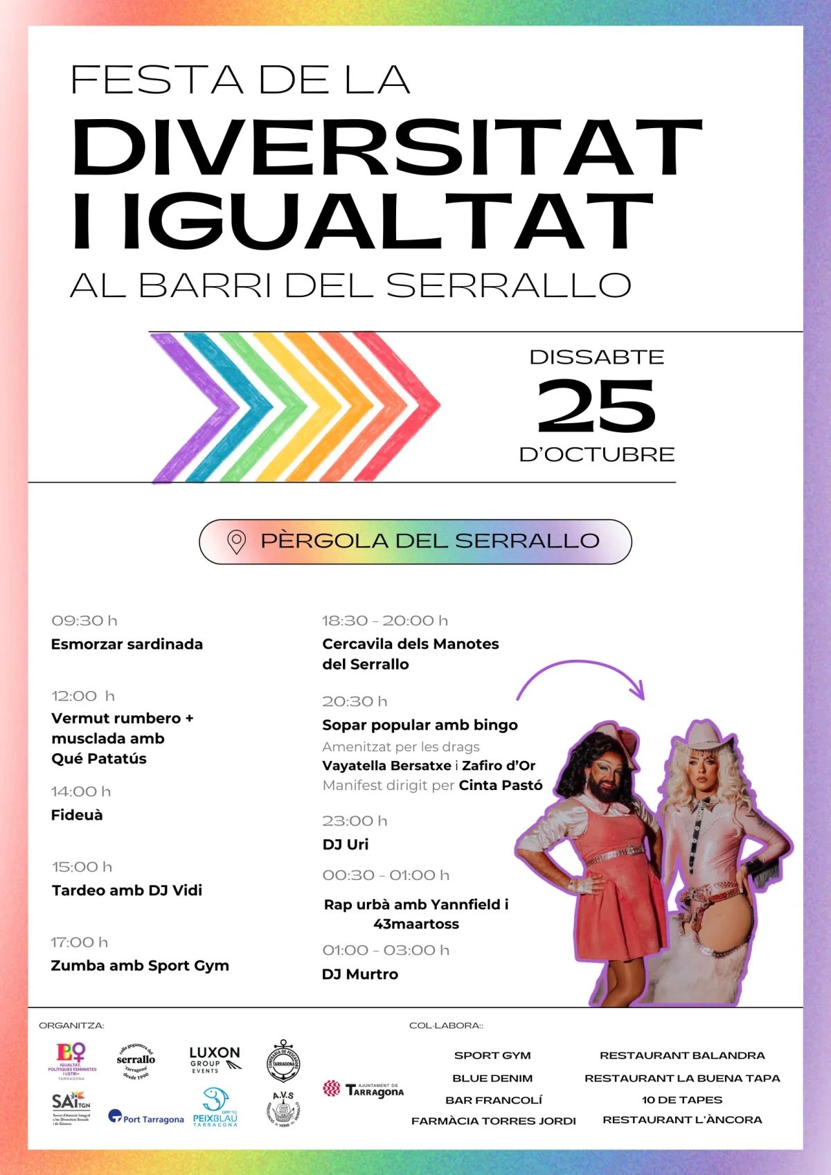 A les 21h hi haurà un sopar popular amb bingo. Anirà amenitzat per les drags Vayatella Bersatxe i Zafiro d’Or. El rap urbà i els disjòqueis culminaran la jornada. La primera festa de la Igualtat i la diversitat al barri del Serrallo, es va celebrar el passat 25 d’octubre, però es va ajornar per la pluja. Aquest proper dissabte se celebrarà l’última part del programa.