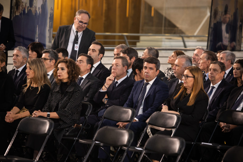 La cerimònia ha comptat amb la presència dels presidents del Congrés i del Senat, del Tribunal Constitucional i del Tribunal Suprem, tots els ministres del govern espanyol encapçalats pel president, Pedro Sánchez, el cap de l’oposició, Alberto Núñez Feijóo, els presidents de les comunitats autònomes, entre ells el del País Valencià, Carlos Mazón, l’assistència del qual ha estat qüestionada per algunes associacions de víctimes, els delegats del govern de les tres comunitats afectades per la dana, portaveus parlamentaris de les cambres legislatives estatals i autonòmiques, alcaldes dels municipis afectats i representants dels agents socials, entre d’altres.