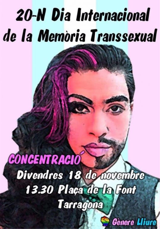 La nova plataforma Gènere Lliure ha convocat aquest migdia una concentració a la plaça de la font pel Dia Internacional de la Memòria Transsexual, que es celebra el diumenge 20 de novembre. Amb una actuació simbòlica es vol recordar les persones que han mort per la seva condició transsexual. Alfonso Volpini, membre de la plataforma Gènere Lliure, ha explicat a Tarragona Ràdio que tot i que no s’ha donat cap cas d’agressió a la ciutat, si que es mostra cert rebuig cap aquestes persones. El col·lectiu va néixer després del dia internacional de l’orgull LGTBQ, del 28 de juny, a l’adonar-se que Tarragona necessitava una plataforma que lluites pels seus drets.