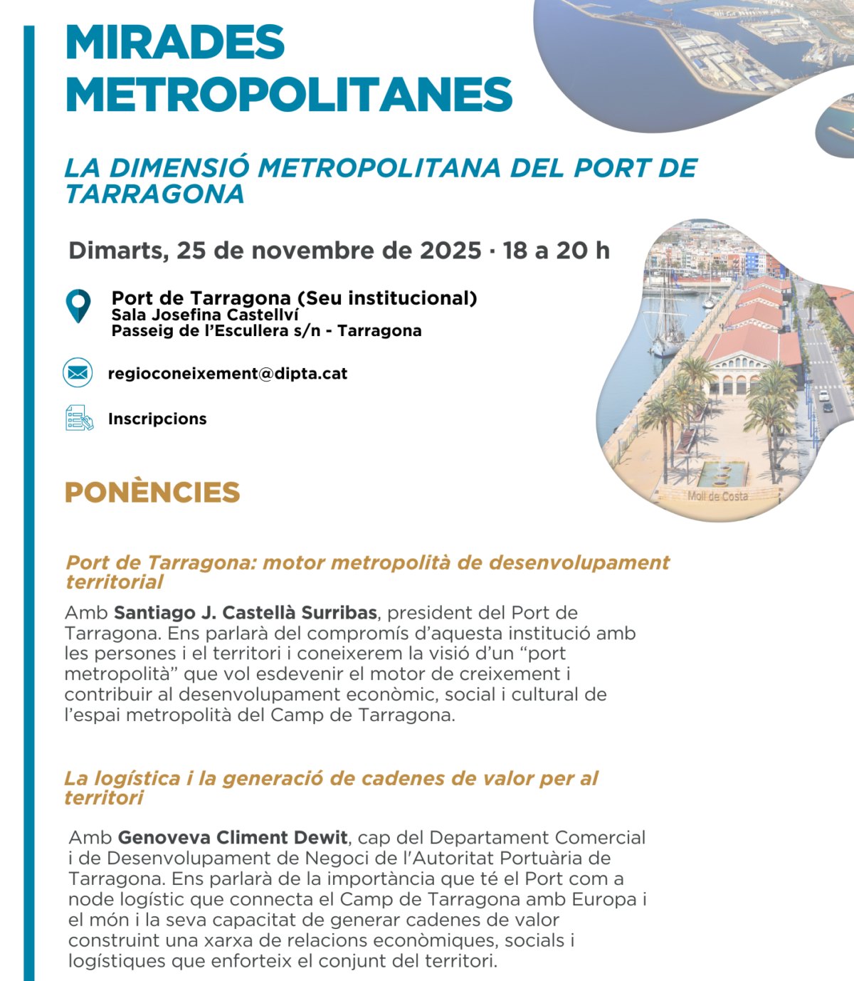 La sessió comptarà amb la participació de Vale Pino, diputat delegat de Projectes Europeus de la Diputació de Tarragona; Santiago J. Castellà, president del Port de Tarragona, i de Genoveva Climent, cap del Departament Comercial i de Desenvolupament de Negoci de l’Autoritat Portuària. Els ponents parlaran sobre la dimensió metropolitana del Port i el seu paper com a motor de desenvolupament territorial, posant èmfasi en la seva importància com a node logístic i generador de cadenes de valor.