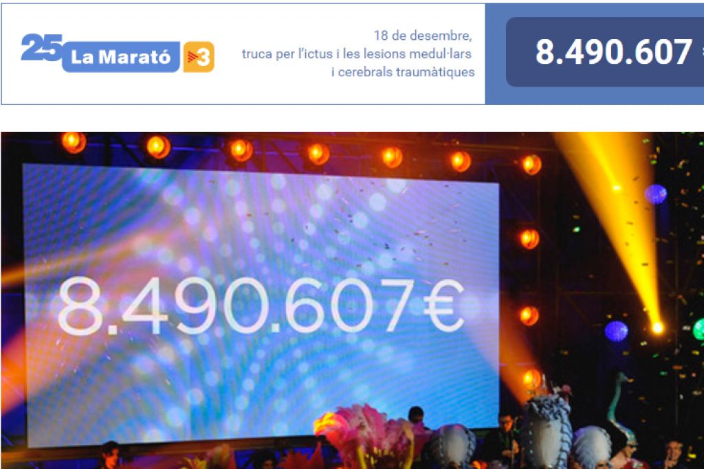 La Marató de TV3 i Catalunya Ràdio ha superat els 8,4 milions d’euros. La 25a edició del programa solidari està dedicada a la lluita contra l’ictus i les lesions medul·lars i cerebrals traumàtiques. Segons el Departament de Salut, l’ictus és la primera causa de mort entre les dones i la tercera entre els homes.