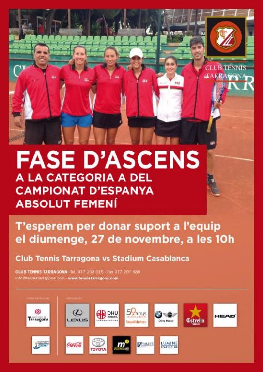 L’ Equip absolut femení del tenis Tarragona es juga aquest proper diumenge l’ acens a la màxima categoria , ho fa a casa en una eliminaria davant l’ Stadium Casa Blanca. El darrer cop en que van jugar- se l’ ascens justament van ser Davant el mateix conjunt aragonès.