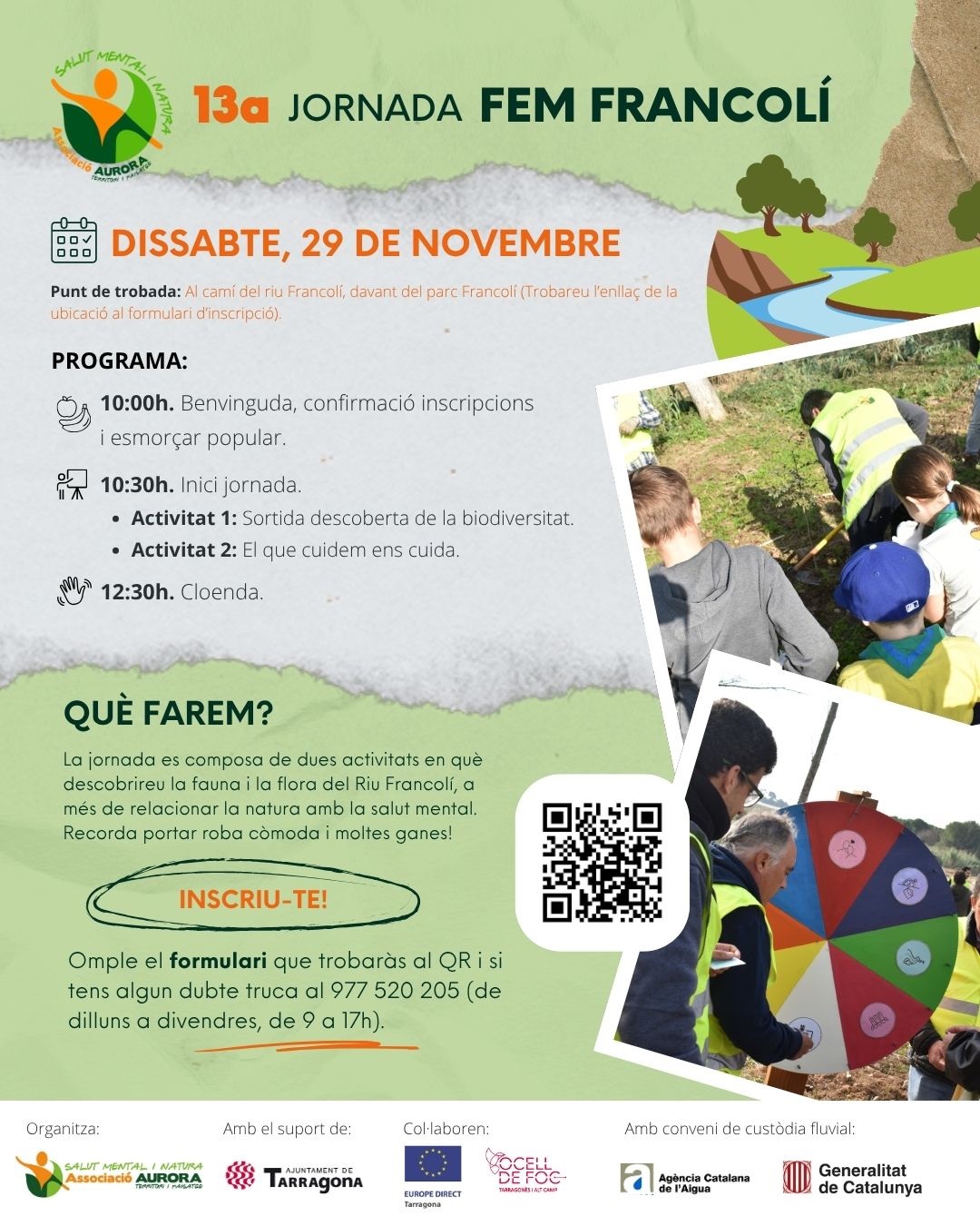 L’Associació Aurora celebra la 13a jornada ‘Fem Francolí’ dedicada a la conscienciació i conservació de la natura i a la salut mental. La trobada serà aquest dissabte 29 de novembre al riu Francolí.