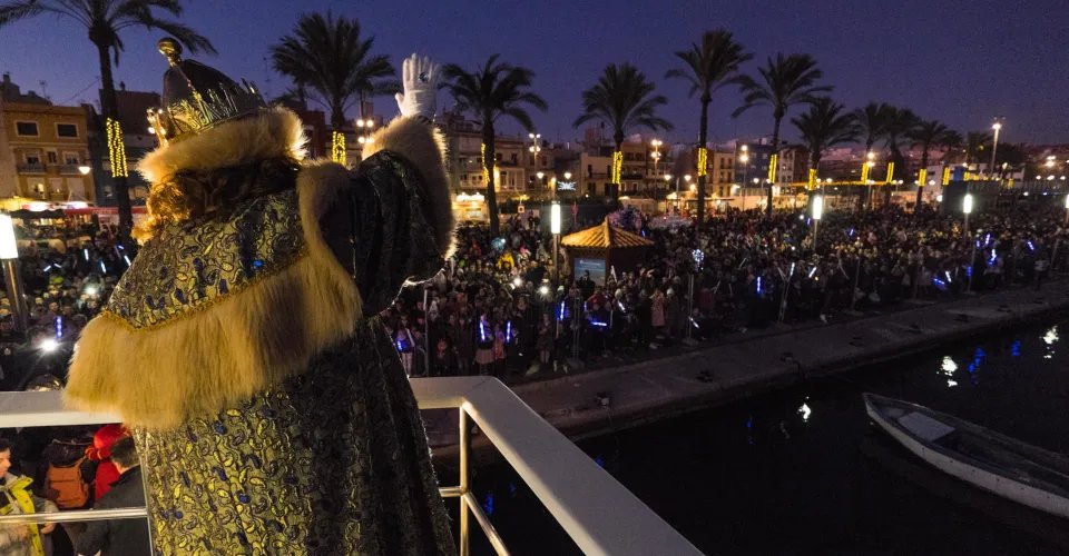 Ses Majestats van arribar al barri marítim del Serrallo a les 18.15 h, a bord d’un vaixell, on van ser rebuts per les barques del Port i amb 21 salves pirotècniques en el seu honor. Tot seguit, la consellera de Cultura i Festes, Sandra Ramos, va pronunciar el parlament de benvinguda, abans que els Reixos saludessin els assistents des del balcó del Teatret del Serrallo. L’acte va culminar amb focs artificials de benvinguda abans que la comitiva es traslladés fins al carrer Reial, punt d’inici de la Cavalcada.