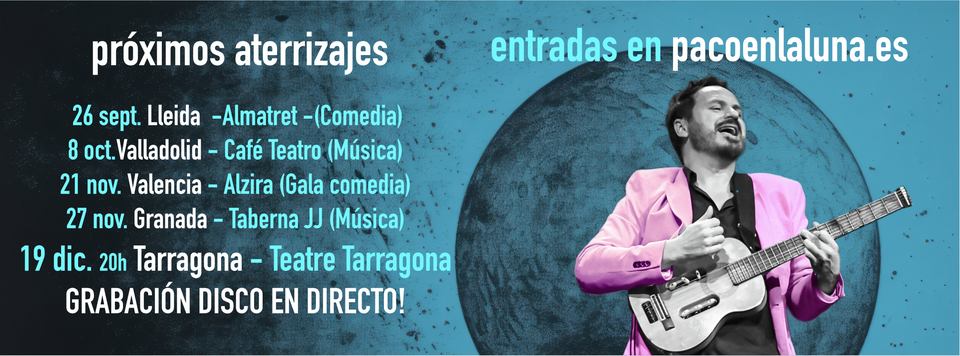 El proper 19 de Desembre podrem gaudir de la gravació en directe del darrer disc de Paco EnlaLuna. Un moment únic per poder gaudir de totes les cançons i sorpreses que aquest Showman tarragoní ens voldrà oferir. Les entrades anticipades a: https://entrades.tarragona.cat/?action=PU_evento&Ev_id=1723