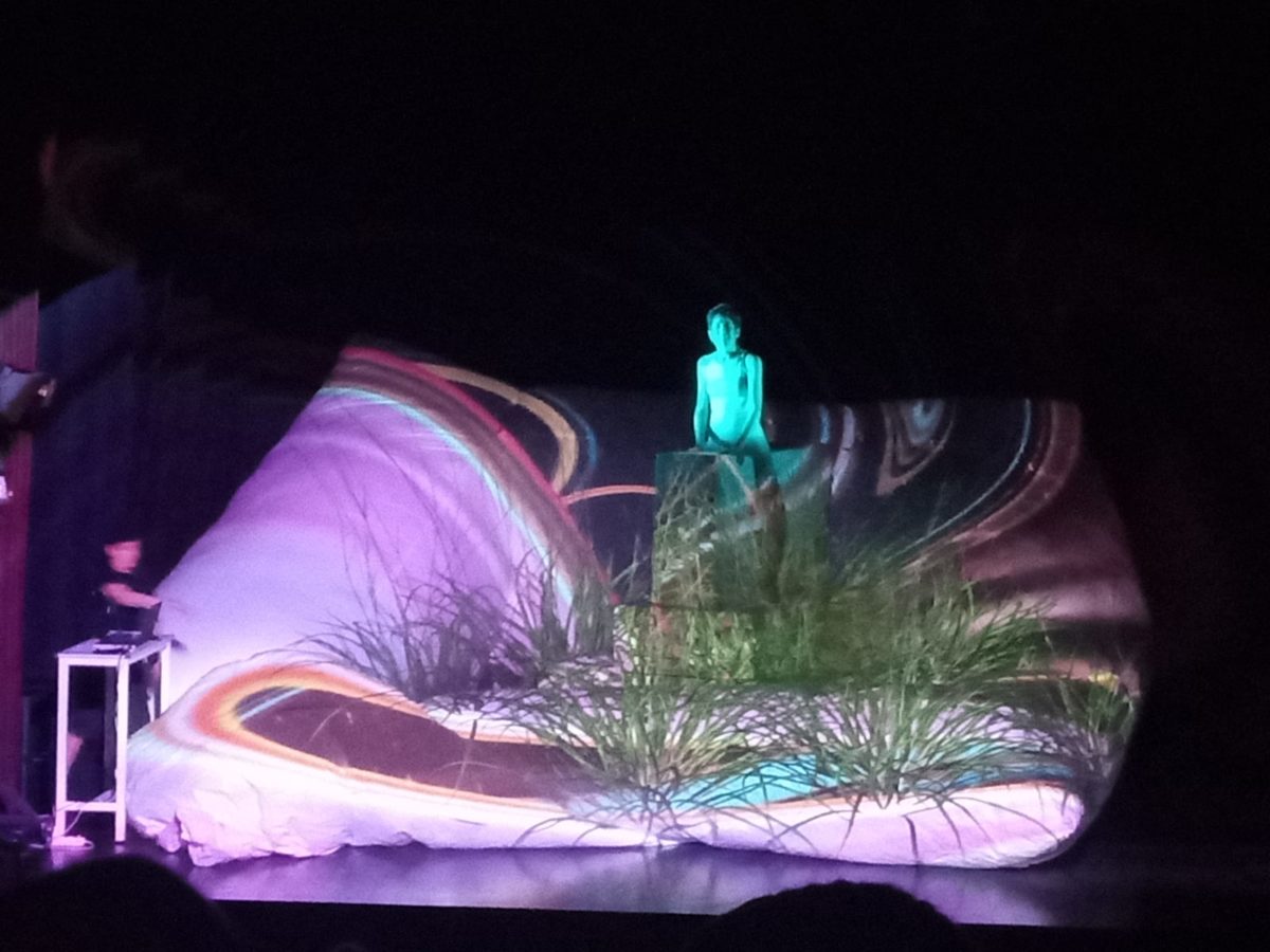 I al sortir, cap al Camp de Mart, on ja ens esperava el bus que ens portaria a Riudoms. Al teatre auditori del casal Riudomenc ens esperava un animal mitològic insistent, tant insistent que en lloc de mite, és realitat. El mite és l’hermafrodita, la realitat són les moltes persones intersexuals. “Hermafrodites a cavall” va d’això, d’explicar al públic què és i què significa ser una persona intersex; remarcar el fet que han existit desde sempre, i com cultural, social i mèdicament se les ha tractat.