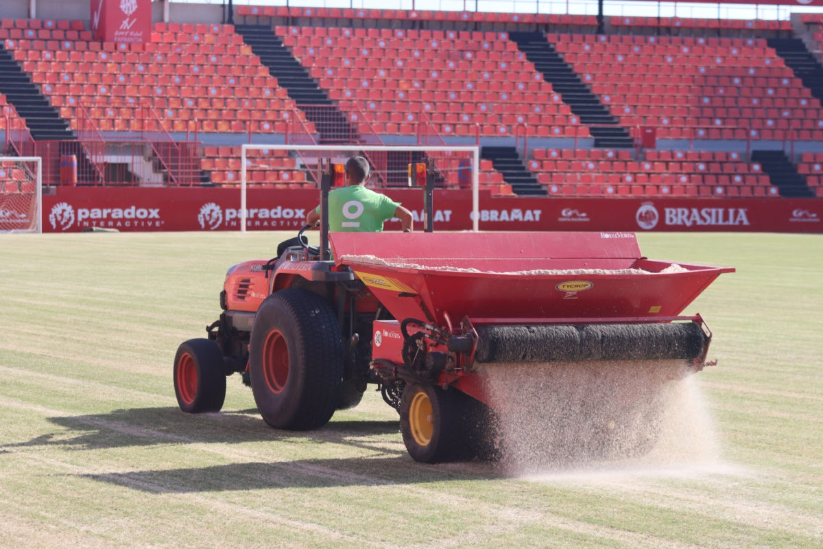 RoyalVerd, l’empresa encarregada del manteniment dels camps de futbol del Gimnàstic de Tarragona, ja ha rascat tot el terreny de joc i està en procés de ressembrar la llavor de la varietat Ray-grass. Està previst que la nova gespa estigui a punt pel duel del 12 d’octubre, a les 18.45 h, davant l’AD Alcorcón.