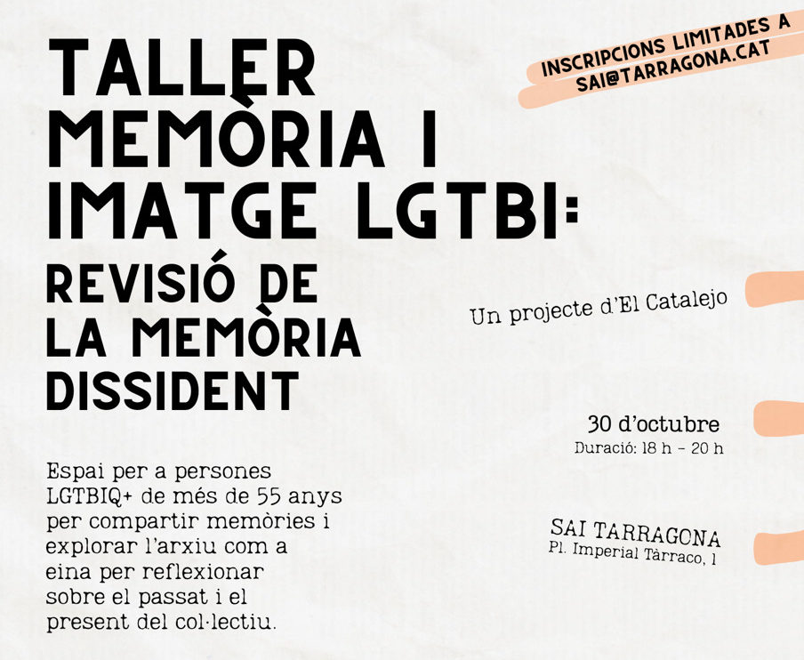 Aquest dijous 30 d’octubre, arriba a Tarragona Memòria i Imatge LGTBI+: revisió de la memòria dissident, un taller adreçat a persones LGTBI+ majors de 55 anys amb l’objectiu de preservar la memòria i la història del col·lectiu. L’activitat, impulsada pel projecte El Catalejo amb la col·laboració de la conselleria d’Igualtat, Polítiques Feministes i LGTBI+ de l’Ajuntament de Tarragona, tindrà lloc a les 18 h al Servei d’Atenció Integral a les Diversitats Sexuals i de Gèneres de Tarragona (SAI), ubicat a la plaça Imperial Tàrraco, número 1.