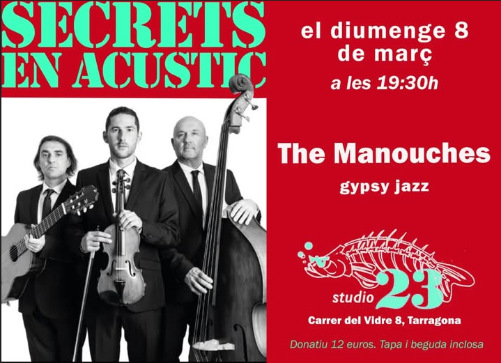 Amb tota la màgia del Gipsy i del Jazz arriben, aquest Diumenge 8 de març, els The Manouches a Studio 23, al Carrer del Vidre 8, per oferir-nos un concert ple de ritmes i bons sabors. La donació d’entrada és de 12 euros i pots gaudir del concert amb una copa de vi i una tapa.