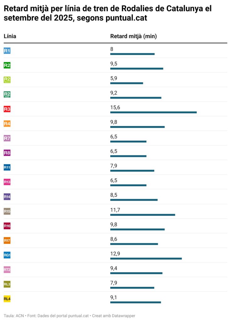 Paral·lelament, també mostra el retard acumulat a totes les línies, ja sigui en funció de si és un dia feiner o festiu, o del sentit que tingui el tren. Així mateix, es pot observar detalladament cada tren. Per exemple, s’observa que a l’R-13, entre Sant Vicenç de Calders i la Riba, el retard mitjà de la línia és d’uns 15 minuts. Però quan s’analitzen totes les expedicions que hi ha cada dia, es comprova que el tren que surt a les 12.40 hores acumula, de mitjana, una hora de retard; mentre que la resta de serveis tenen endarreriments de 7 minuts com a màxim.