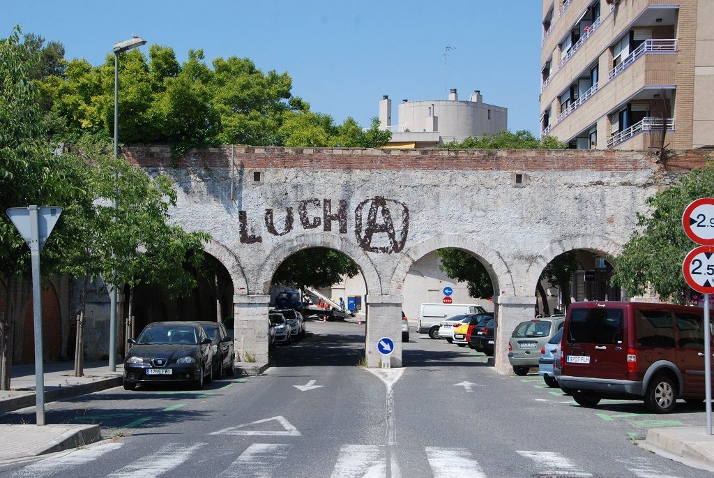 Una pintada de grans dimensions ha aparegut a l’aqüeducte de la Mina de l’Arquebisbe de Tarragona. S’hi llegeix en majúscules la paraula castellana LUCHA amb la lletra ‘a’ encerclada.